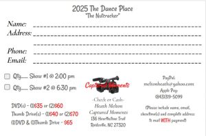 If you are interested in purchasing a DVD and/or thumb drive please complete the form and bring it along with cash or check made payable to Heath Melton, Captured Moments, to Mr Melton by the end if the final performance. (This will allow you to choose the one you prefer) If you pay electronically be certain to include the same info requested on the form in the notes. The cost includes shipping.